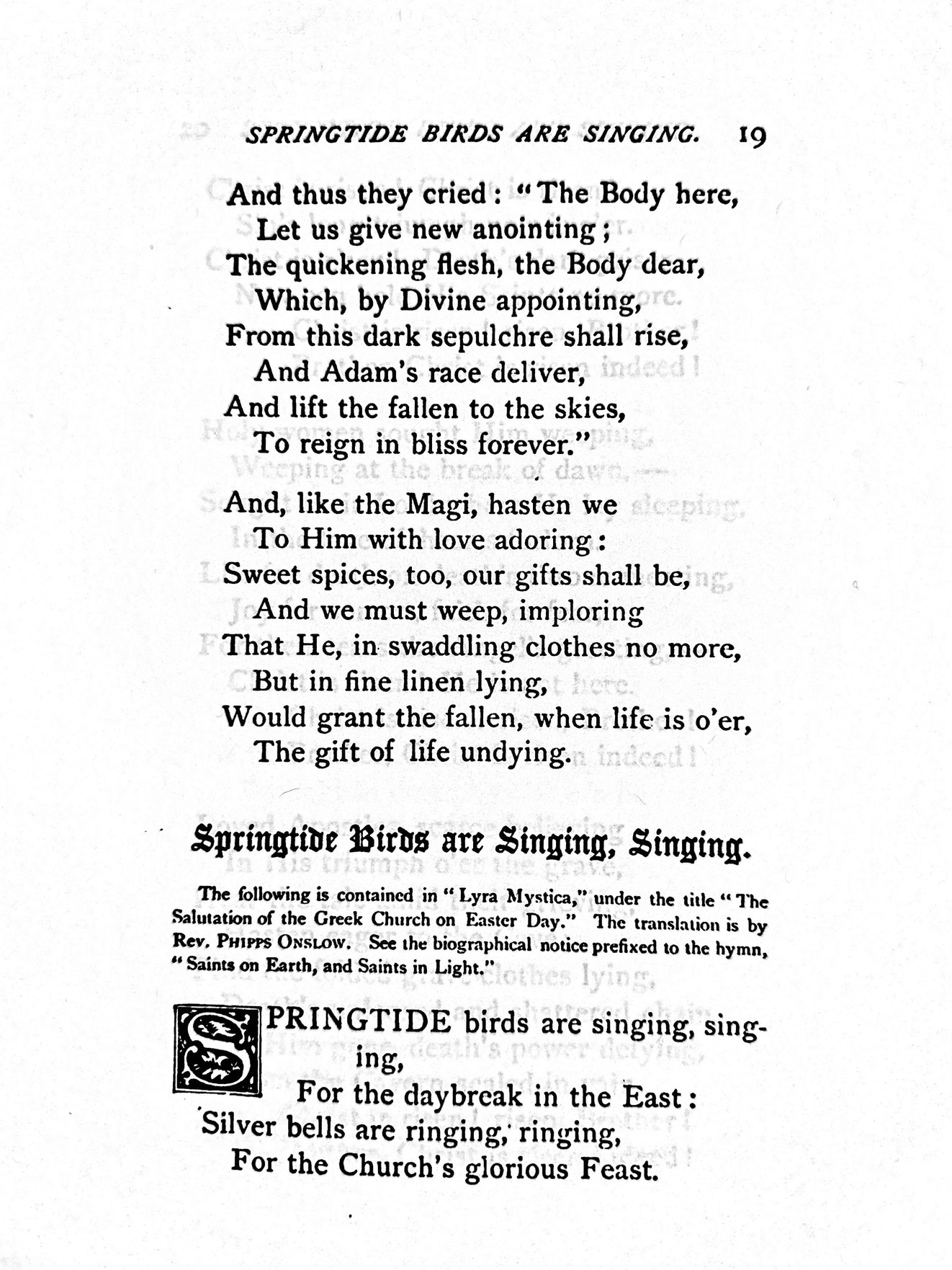 The text comes from an ancient Greek hymn translated in the 19th century by Englishman Phipps Onslow (could there be a more English name than that?) The first line in his full version is “Springtime birds are singing, singing” and I have posted a pdf scan of the full original text.